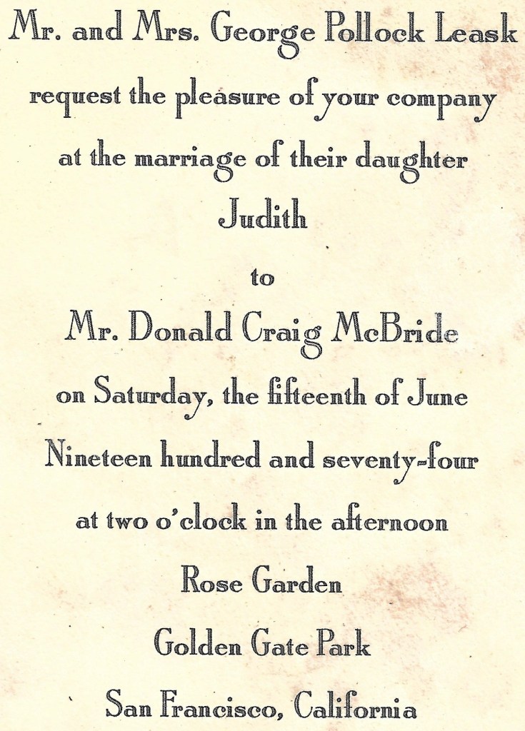 Back to Don. He invited us to his apartment for dinner where we had a charming reunion. Just as kind and delightful as ever. He’d given up booze, saying that it didn’t suit him; he was an unhappy drunk. He announced that he had met “the one”, a girl named Kari McCabe. They married – sounded like a good Irish union - and have worked together ever since, Nate (now) as an architect, Kari as an interior designer. I found out in a recent cellar clearance that I’d missed another opportunity to see Don at his first wedding to Judith. I never met her, the event and relationship completely forgotten. Here’s the invitation and a postcard from Don. The Rose Garden in Golden Gate Park, San Francisco. It would have been a great trip. ![]()